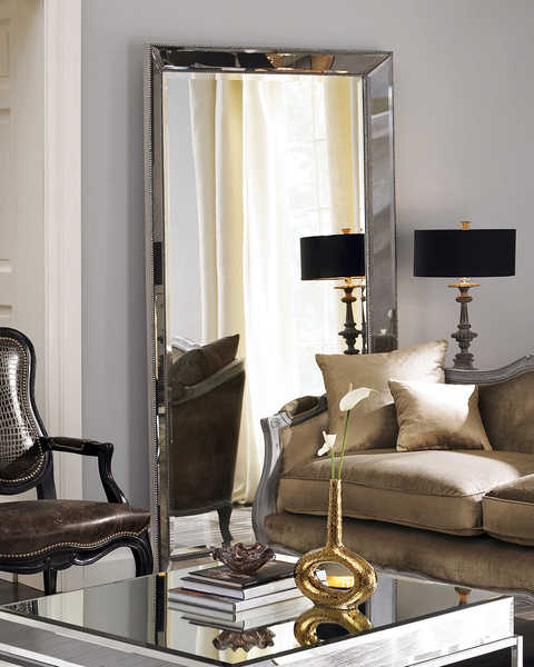 Eleganckie duże lustro w ramie lustrzanej ze zdobieniami w kolorze srebrnozłotym postarzanym.