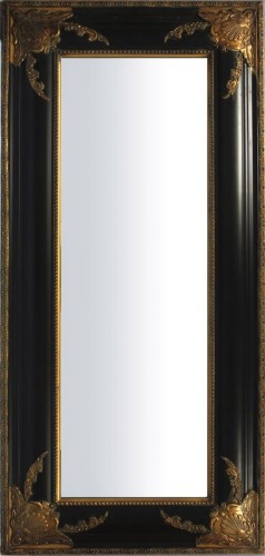 Rama lustra wykonana jest z drewna. Wykończona w kolorze czarnym. Dodatkowo posiada zdobienia pokryte złotą patyną. Tafla lustra kryształowa. Całość wykonana starannie i estetycznie. Lustro przystosowane jest do powieszenia zarówno pionowo jak i poziomo.