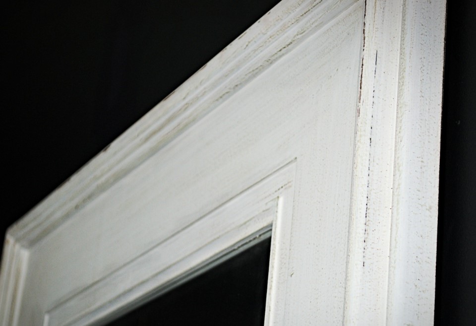 Efektowna frezowana rama wykonana jest z drewna i wykończona w kolorze białym. Dodatkowo poddana jest procesowi postarzania poprzez niezwykle efektowną technikę ręcznego przecierania ramy.