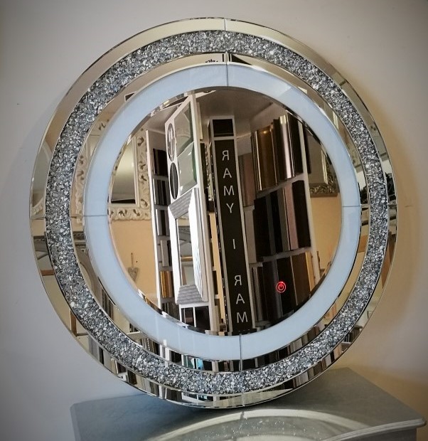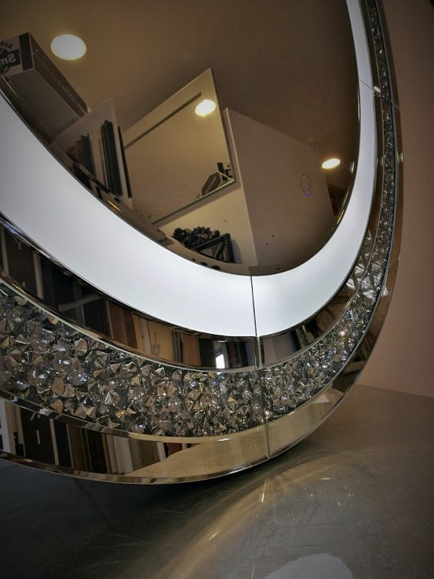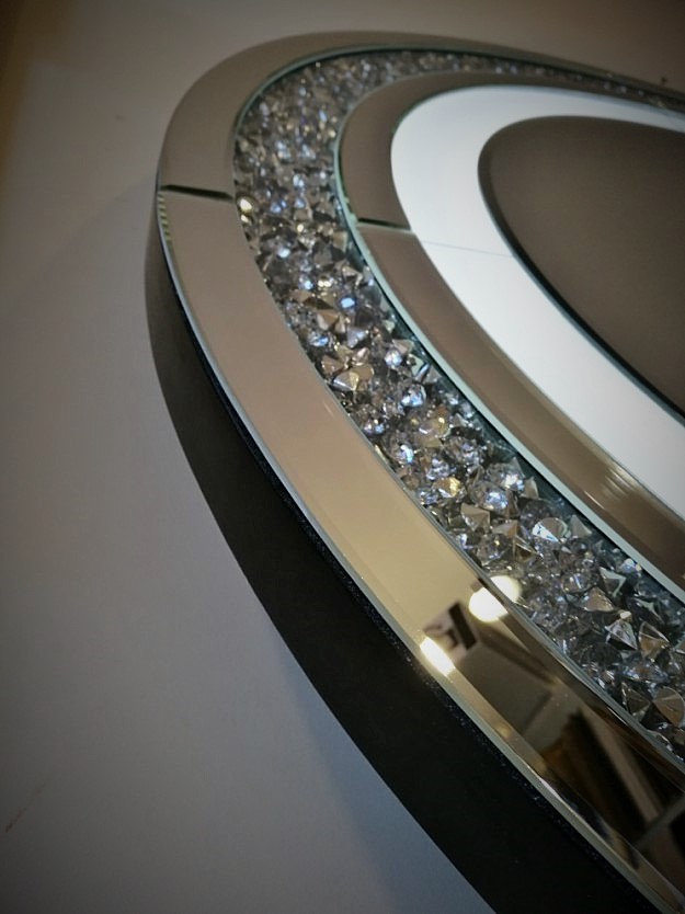 Okrągłe lustro zamknięte w ramie z elementów lustrzanych, przedzielonych dekoracyjnymi kryształami umieszczonymi za przeźroczystym szkłem.