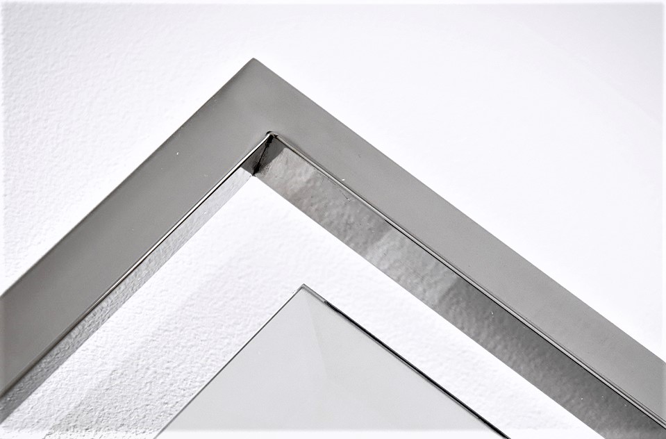 Prosta rama z polerowanej srebrnej stali nierdzewnej okala kryształowe lustro z fazą.