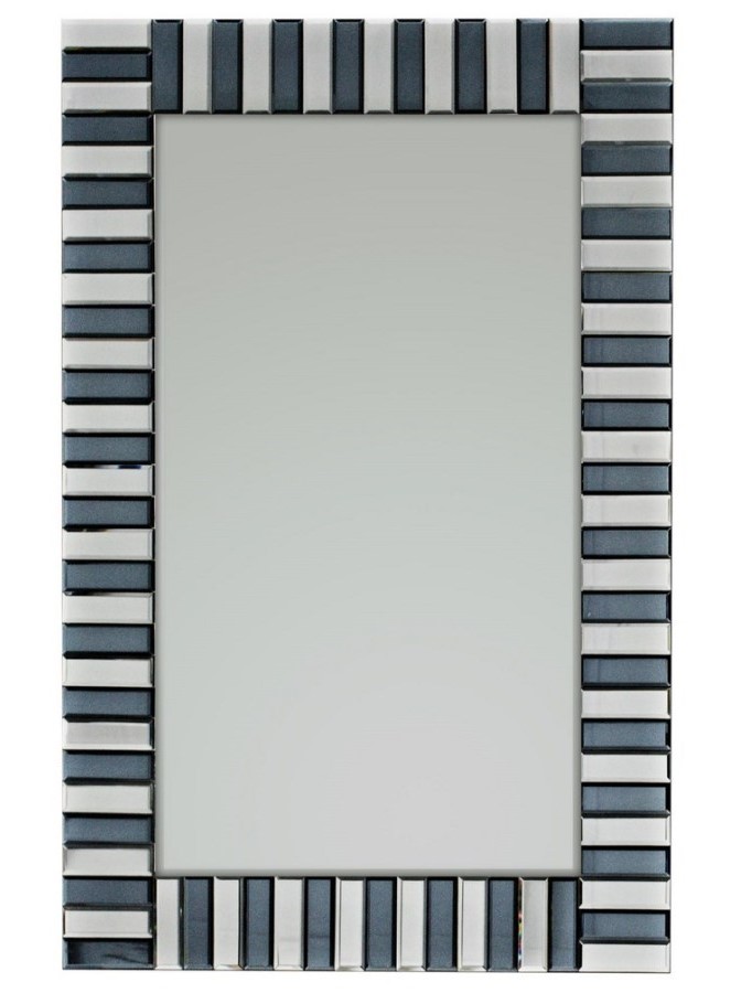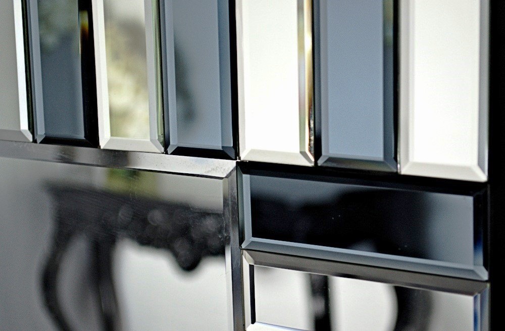 Kryształowe lustro, w którym tradycyjną ramę zastępują starannie szlifowane prostokątne elementy z luster srebrnych i grafitowych.