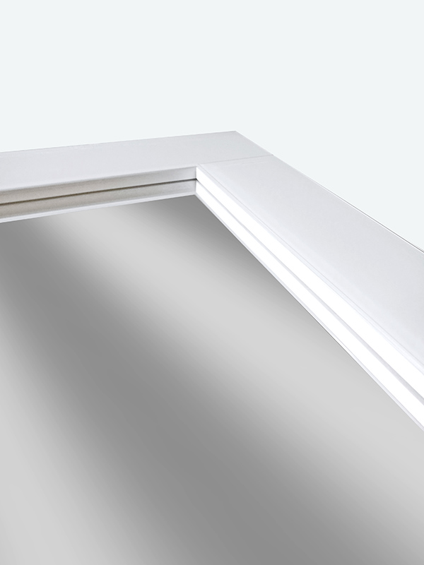 Solidna rama wykonana jest w 100% z litego drewna, którą od przodu wykończono gładkimi elementami białego szkła lakobel łączonymi na prosto.