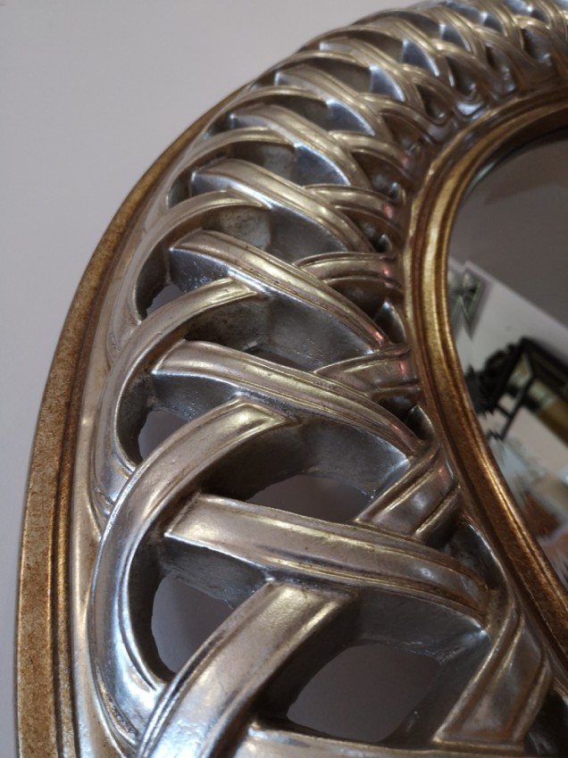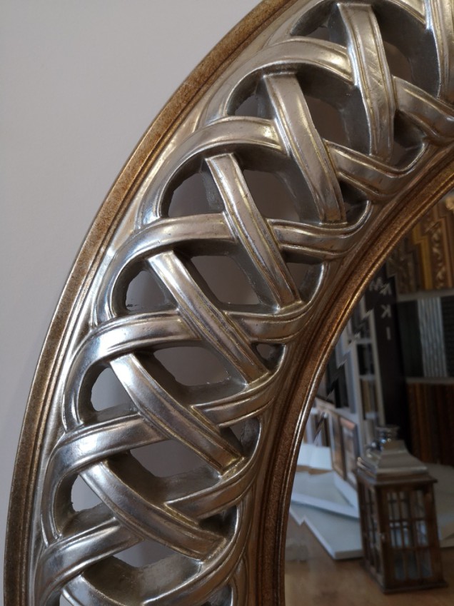 Ramę wykonano z masy żywicznej i wykończono szlagmetalem w kolorze szampańskie srebro.