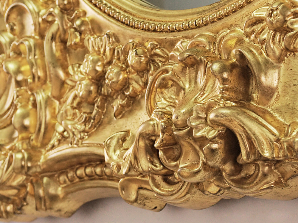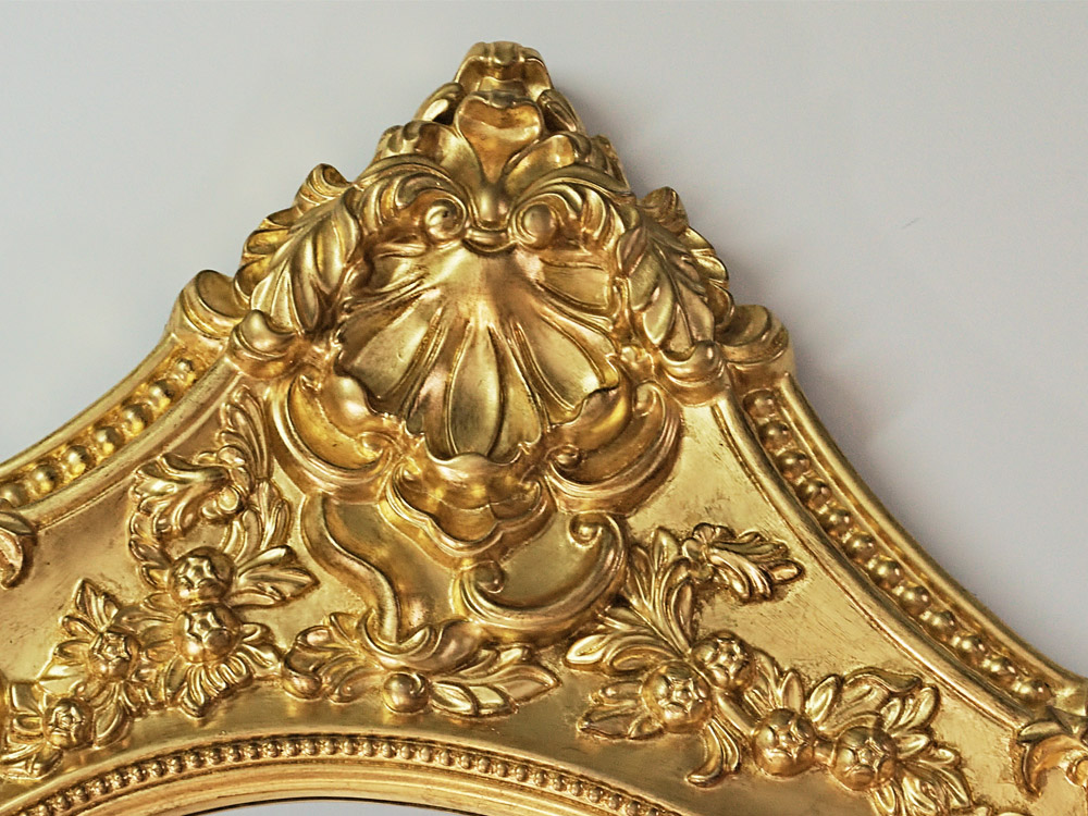 Cała rama wykończona jest ręcznie nakładanym szlagmetalem, w kolorze postarzanego złota.