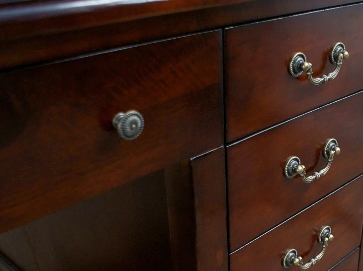 Tył biurka wykończony drewnem, dzięki temu mebel można umieścić w dowolnym miejscu (np. na środku gabinetu)
