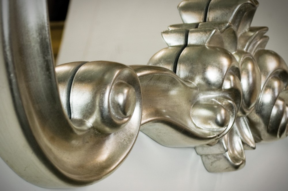 Rama lustra wykonana jest ze specjalnej wysokogatunkowej masy żywicznej i pokryta srebrnym szlagmetalem. Szlagmetal to cieniutkie listki metalu, ręcznie nakładane i dodatkowo przecierane kamieniem Agatu. Efektem jest niepowtarzalna struktura i kolor ramy.
