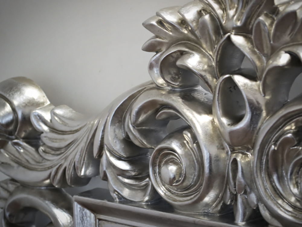 Rama ze specjalistycznej masy żywicznej wykończona jest ręcznie nakładanym srebrnym szlagmetalem.