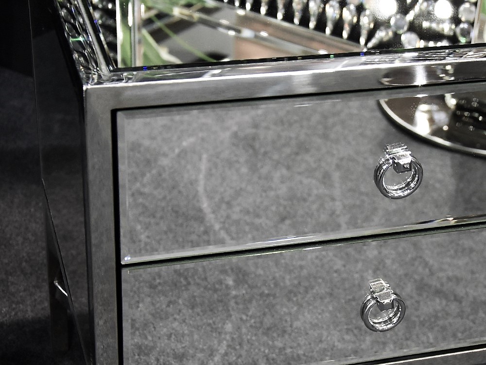 Mebel wykończony elementami stali nierdzewnej i kryształowego lustra.